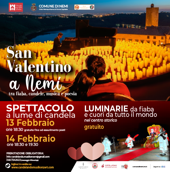Nemi, 3 Feb – Il Comune di Nemi celebra la festa degli innamorati con l’iniziativa “San Valentino a Nemi – tra fiaba, candele, musica e poesia”, un evento suggestivo che il 13 e 14 febbraio trasformerà il borgo in uno scenario romantico e senza tempo.